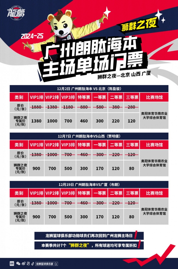 本階段(2024年11月-12月)共有3個(gè)“獅群之夜”主場日!球迷均可享受特別優(yōu)惠!我們盛情邀請所有龍獅球迷一道歡迎曾身披廣州龍獅戰(zhàn)袍、與球隊(duì)共同無畏前行的功勛球員們(陳盈駿、賈明儒、布朗)回到“獅群”中,以他們最熟悉的掌聲和歡呼聲送上誠摯的祝福并共同重溫曾經(jīng)一起創(chuàng)造的所有美好時(shí)刻!