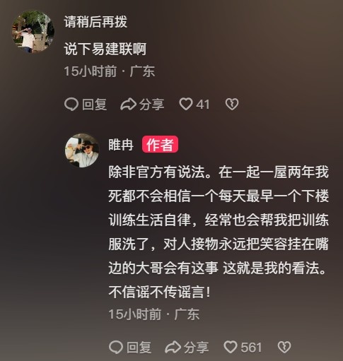 他寫道:“除非官方有說(shuō)法。在一起一屋兩年,我死都不會(huì)相信一個(gè)每天最早一個(gè)下樓、訓(xùn)練生活自律,經(jīng)常也會(huì)幫我把訓(xùn)練服洗了,對(duì)人接物永遠(yuǎn)把笑容掛在嘴邊的大哥會(huì)有這事。這就是我的看法。不信謠不傳謠言!”