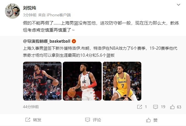 五星體育記者劉悅純轉發(fā)了導演的這條動態(tài),并在旁邊寫道:“假的不能再假了……上海男籃沒有簽他,進攻防守都一般,現(xiàn)在壓力那么大,教練組考慮肯定慎重再慎重了~”
