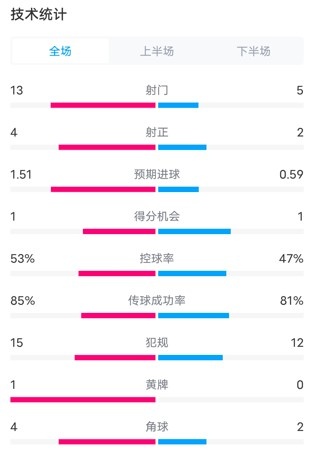 國(guó)米1-1那不勒斯全場(chǎng)數(shù)據(jù):射門13-5,射正4-2,控球率53%-47%