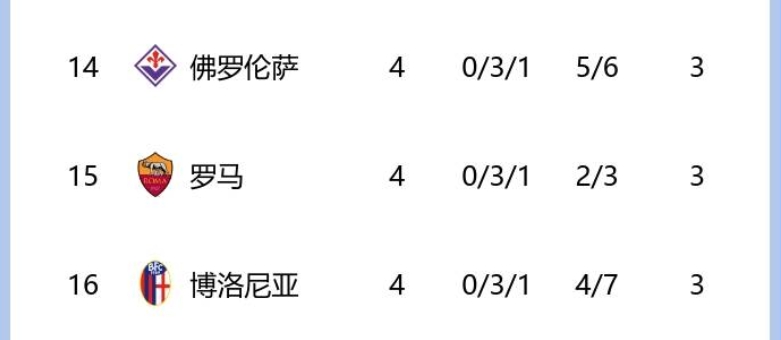 羅馬&博洛尼亞&佛羅倫薩前4輪都只拿3分,如今積分:13、18和25!