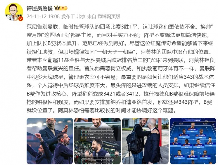 詹俊在個(gè)人微博中寫道:范尼告別曼聯(lián),臨時(shí)接管球隊(duì)的四場(chǎng)比賽3勝1平,這讓球迷們更依依不舍。換帥”蜜月期“這四場(chǎng)正好都是主場(chǎng),而且對(duì)手實(shí)力不強(qiáng);陣型不變踢法更加簡(jiǎn)潔快速,加上隊(duì)長(zhǎng)B費(fèi)狀態(tài)飆升,范尼已經(jīng)做到最好。盡管這位紅魔傳奇希望能夠留下來(lái)繼續(xù)擔(dān)任助教,但職場(chǎng)規(guī)律如同”一朝天子一朝臣“,阿莫林的團(tuán)隊(duì)中沒(méi)有他的位置。