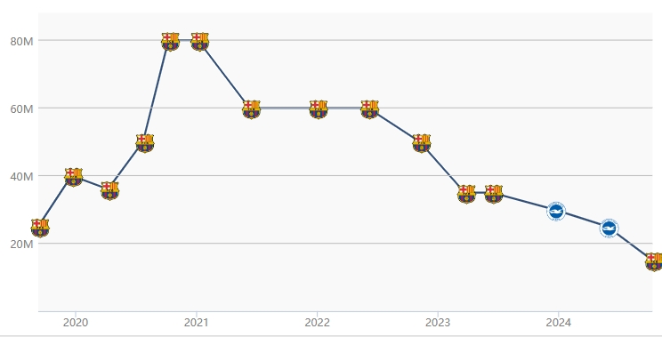 值得一提的是,22歲的法蒂目前德轉(zhuǎn)身價僅為1500萬歐元,在2020年法蒂身價一度達到8000萬歐元,此后球員屢遭傷病影響,并在上賽季租借前往布萊頓,但表現(xiàn)同樣沒能達到預(yù)期。