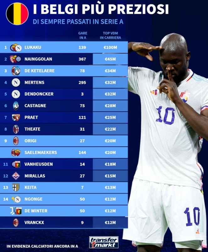 11月15日訊 在意甲賽場上,有一批比利時球員成為球隊的核心球員,德國轉(zhuǎn)會市場盤點了意甲歷史身價最高的比利時球員,盧卡庫1億歐元居首。