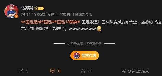賽后,記者馬德興社媒表示:國(guó)足牛逼!巴林隊(duì)賽后發(fā)布會(huì)上,主教練塔拉吉奇與巴林記者干起來(lái)了,哈哈哈哈哈哈哈[笑cry] ???