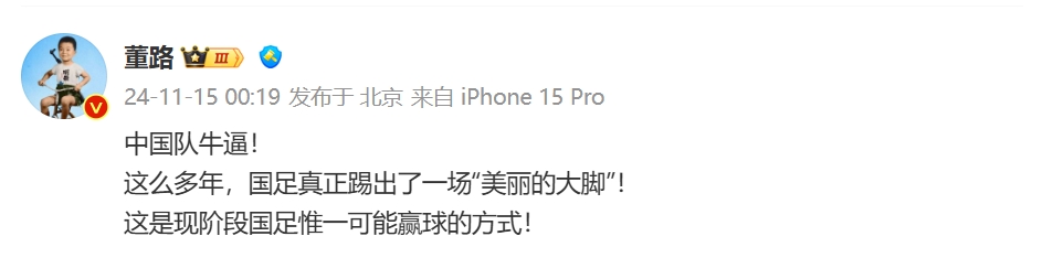 董路:這么多年國足真正踢出美麗的大腳,這是唯一可能贏球的方式 發(fā)布時間: 2024年11月15日 06:29 來源:網(wǎng)絡 11月15日訊 今晚國足1-0絕殺巴林,賽后著名媒體人董路也對本場比賽表達了自己的看法。董路在社媒寫道:中國隊牛逼!這么多年,國足真正踢出了一場“美麗的大腳”!這是現(xiàn)階段國足唯一可能贏球的方式! ??? 標簽: 足球 中超 中國足球 國家隊 中國男足