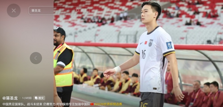 蔣圣龍?jiān)趥€(gè)人社交媒體中寫道:戰(zhàn)斗未結(jié)束,仍需努力,時(shí)刻保持專注,加油中國隊(duì)!