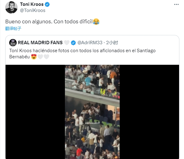 媒體稱克羅斯與伯納烏所有球迷合影,克羅斯調侃:這可有點難 發(fā)布時間: 2024年10月06日 14:37 來源:網絡 10月6日訊 在西甲第9輪比賽中,皇馬主場2-0擊敗比利亞雷亞爾。皇馬名宿克羅斯重返伯納烏觀看比賽,親切地為球迷簽名,并與他們合影。皇馬球迷資訊自媒體曬出視頻,并配文:“克羅斯在伯納烏球場與所有球迷合影。”克羅斯轉載了這條動態(tài),并調侃道:“與一些球迷合影還不錯,與所有球迷合影可挺難 標簽: 籃球 比賽集錦 WNBA 足球 西甲 皇家馬德里