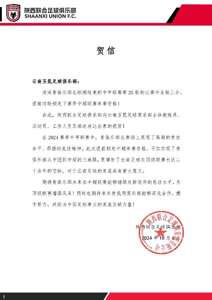 賀信 祝賀云南玉昆足球俱樂(lè)部提前四輪鎖定下賽季中超資格 發(fā)布時(shí)間: 2024年10月06日 23:44 來(lái)源:網(wǎng)絡(luò) 賀信 標(biāo)簽: 西甲 赫塔費(fèi) 奧薩蘇納 比賽錄像 足球 足球 中超 中國(guó)足球 中甲 中乙 云南玉昆 陜西聯(lián)合