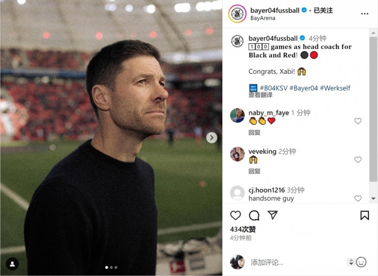此役是阿隆索執(zhí)教勒沃庫森的第100場(chǎng)比賽,勒沃庫森官方社媒祝賀他達(dá)成這一里程碑。