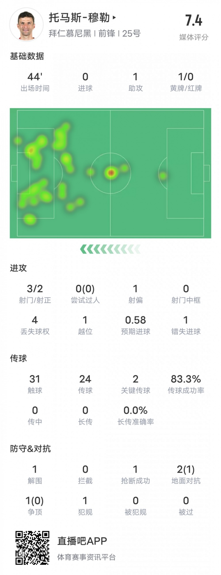 穆勒上半場(chǎng)比賽數(shù)據(jù)如下: