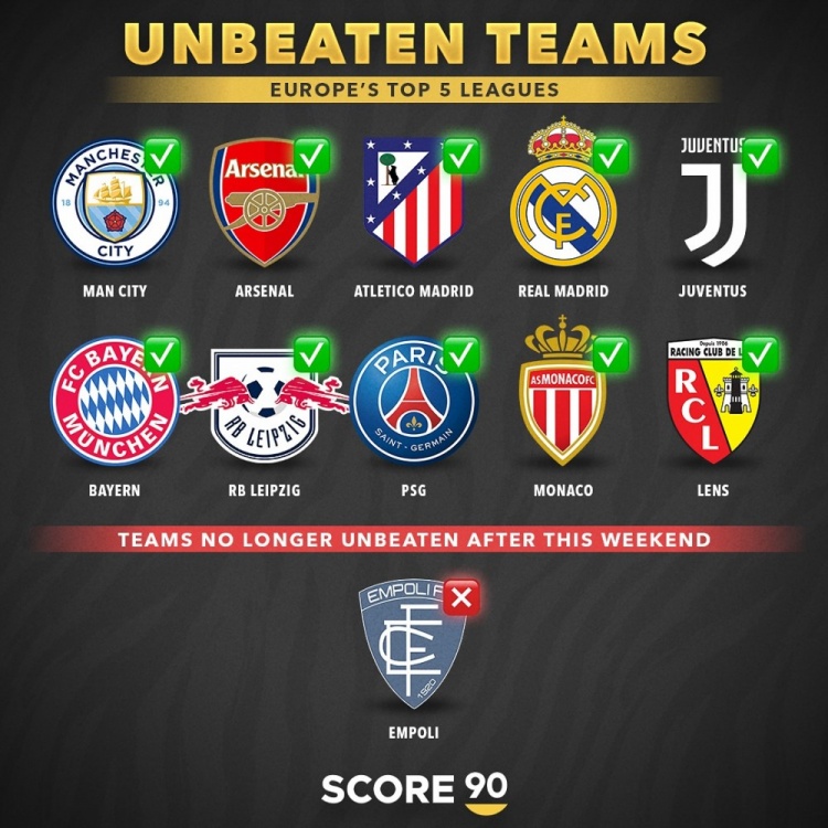 10月7日訊 在意甲第7輪比賽中,恩波利客場(chǎng)1-2不敵拉齊奧,本賽季聯(lián)賽不敗遭終結(jié),據(jù)Score90統(tǒng)計(jì),本賽季五大聯(lián)賽仍有10支球隊(duì)保持不敗。