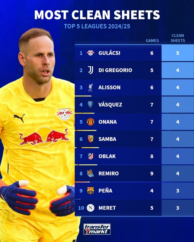 10月9日訊 德國轉會市場統(tǒng)計了本賽季五大聯賽門將的零封場次,并列出榜單,萊比錫門將古拉西零封5次居首,迪格雷戈里奧、阿利森、奧納納等門將零封4次并列第二。