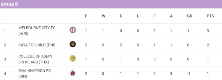 B組四隊為澳大利亞墨爾本城隊、菲律賓卡雅FC隊、泰國亞洲大學隊以及伊朗巴姆卡頓隊。