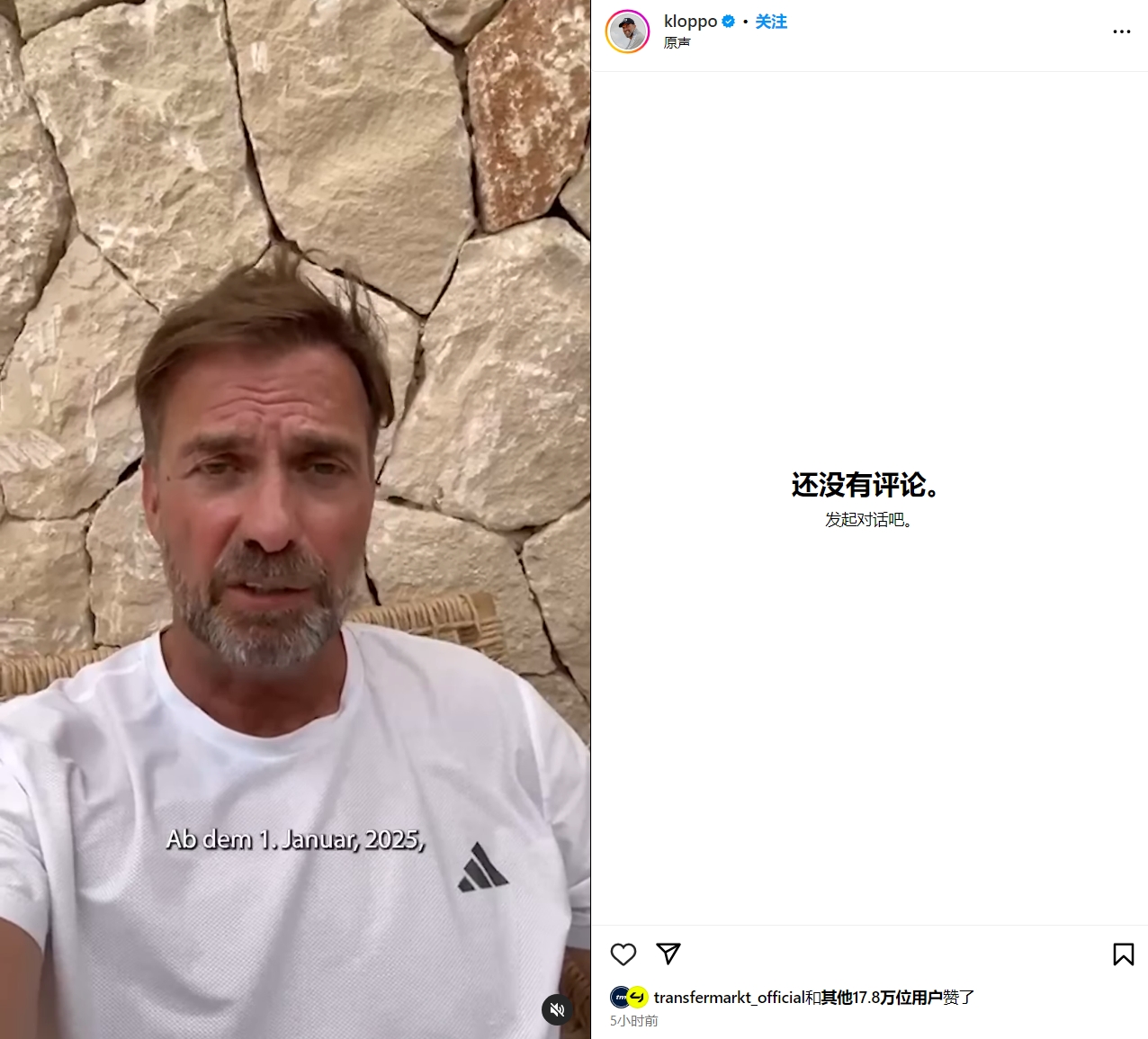 10月10日訊 紅牛官方宣布,克洛普將于明年1月1日起出任紅牛全球足球主管??寺迤赵趥€人ins上發(fā)視頻公布了這一消息,但目前這一條動態(tài)顯示評論未開放。
