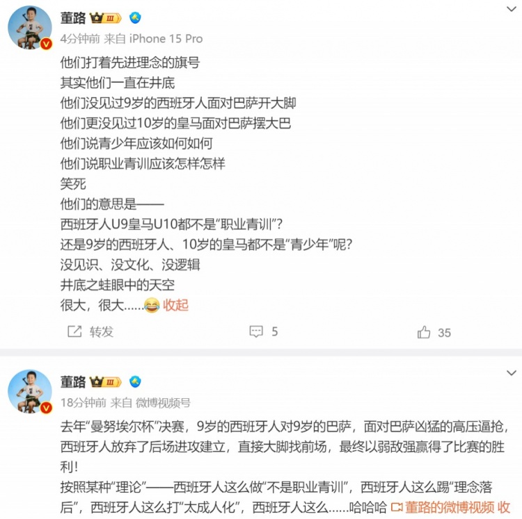 董路:U9西班牙人開大腳、U10皇馬擺大巴,他們不是職業(yè)青訓(xùn)?