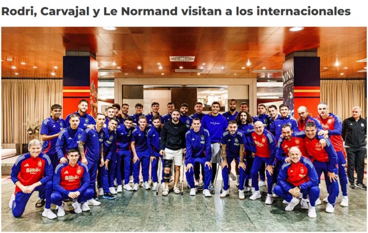羅德里、卡瓦哈爾、勒諾爾芒,這三位球員是幾個(gè)月前的歐洲杯冠軍,現(xiàn)在受傷了,他們來到集訓(xùn)地為他們的國家隊(duì)助威,并受到了由整個(gè)代表團(tuán)的歡迎。