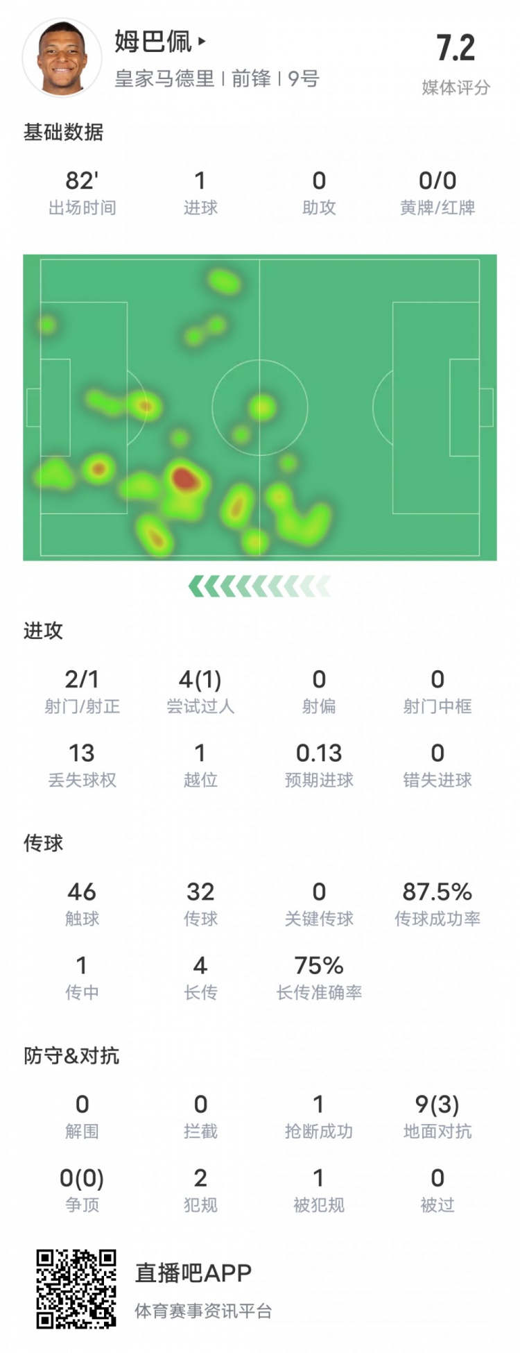 姆巴佩本場(chǎng)比賽數(shù)據(jù):2射1正1進(jìn)球&1過人成功,評(píng)分7.2
