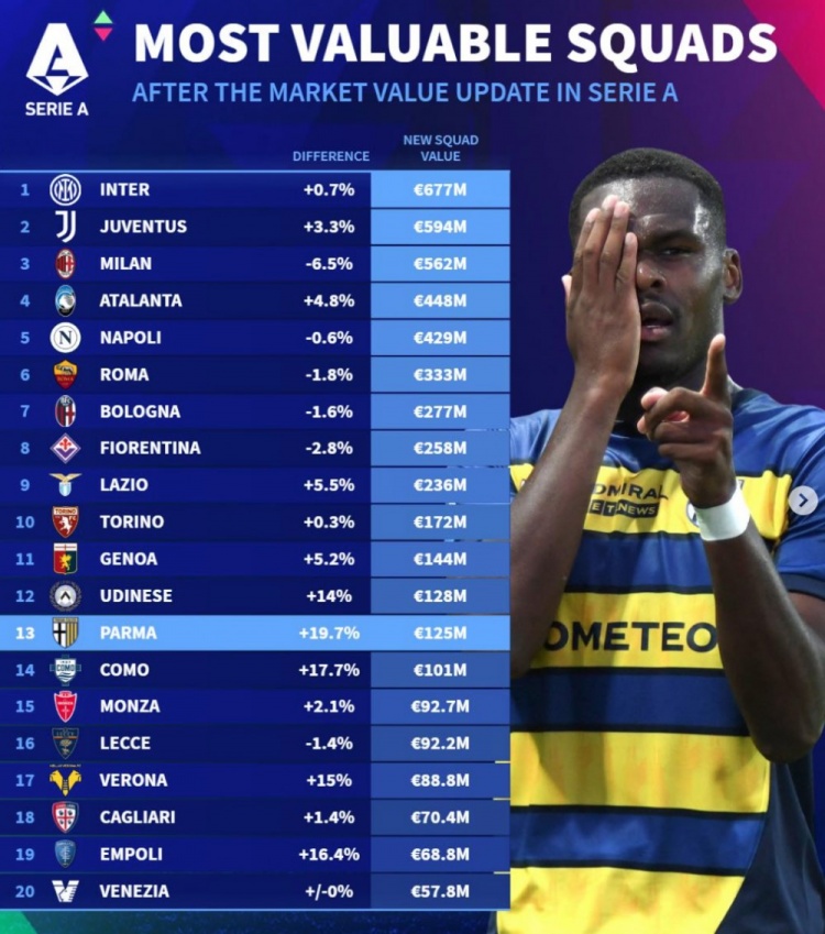 德轉(zhuǎn)列意甲球隊(duì)身價(jià)榜:國米6.77億歐、尤文5.94億、米蘭5.62億